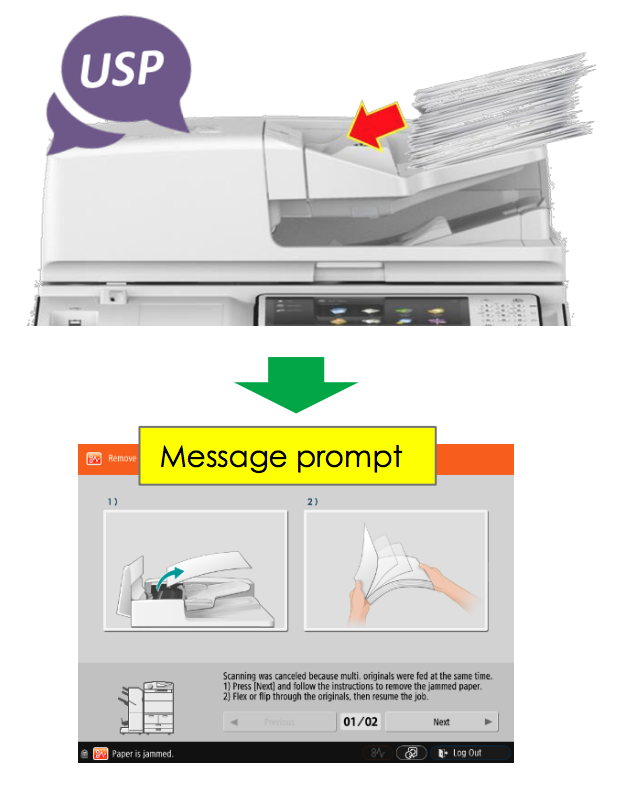 In an operation where user feeds the document for scanning/ copying using the document feeder, if there are multiple pages pulled in by mistake, the printer prompts and informs the user that a sheet has been missed. This ensures that there are no mistakes in scanning/ copying which can prove to be crucial if you miss an important page in the final document. It also saves precious time which may be wasted to re-scan and manually identify the mistakes if any.