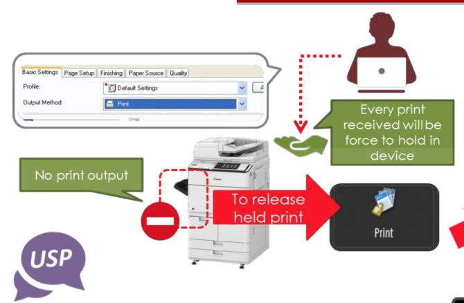 The administrator can configure to enforce the device to hold any job before printing. This ensures document security by preventing unattended prints. Also, it reduces wastage as users can first preview and then prints the job at the printer itself using the touch screen. It reduces cost, improved efficiency and also saves time as a person at the printer can get his job printed as soon as he reaches the printer, as he/she does not have to be in a print queue. This also ensures that any settings mistakes can be corrected even at the last minute at the printer (like a duplex, finishing or quantity) without going back to the computer, hence saving precious time and resources.