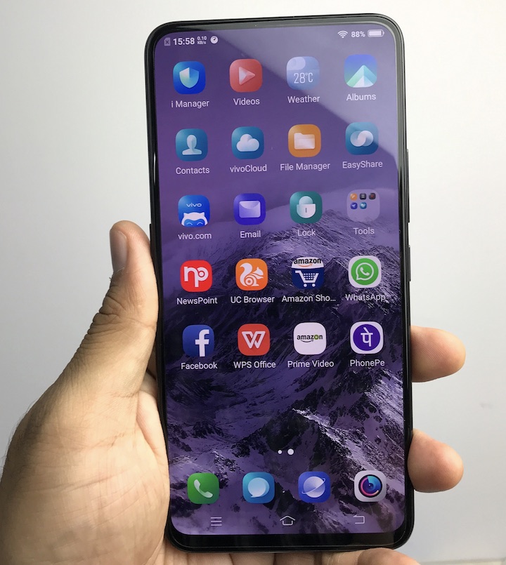 The design of the phone is extremely attractive. It is almost all display at front with practically no bezel. The front sensors are intelligently hidden on top of the display, the front camera is tucked on the top of the phone in the elevating mechanism. All these intelligent design tricks make the display around 91.24% of the total body surface at the front (also called the screen to body ratio).